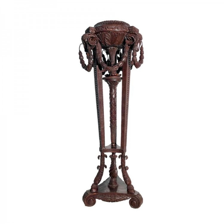 At the top of the stand sits a circular platform adorned with rich relief ornamentation. The decorative surface features intricately cast ram’s head motifs combined with elegant garlands and classical detailing. These design elements reflect ancient symbolism associated with strength, sacrifice, and grandeur, making the piece not just decorative but historically meaningful as well.