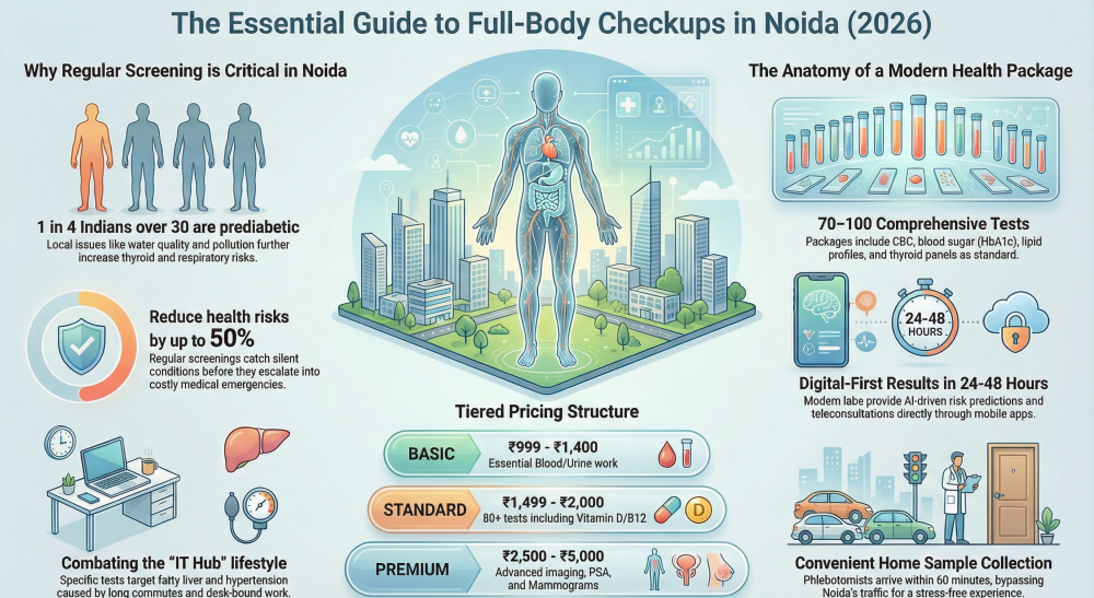 Full body checkup prices in Noida average ₹1800. Discounts via apps.
