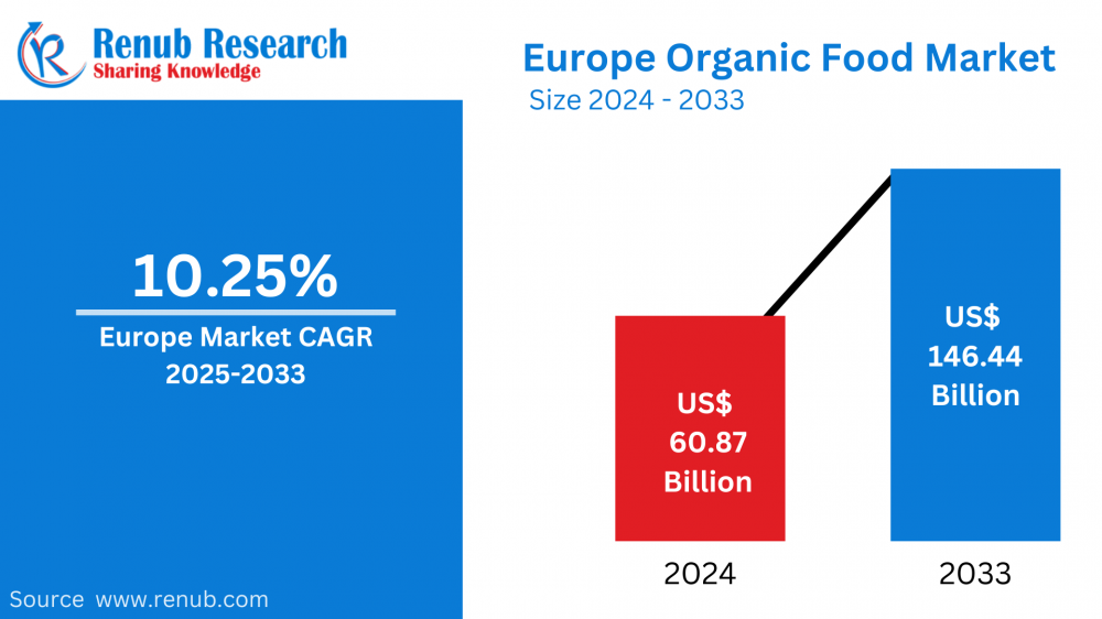 The Europe organic food market is forecasted to reach US$ 146.44 billion by 2033, growing from US$ 60.87 billion in 2024 at a CAGR of 10.25% during the forecast period.