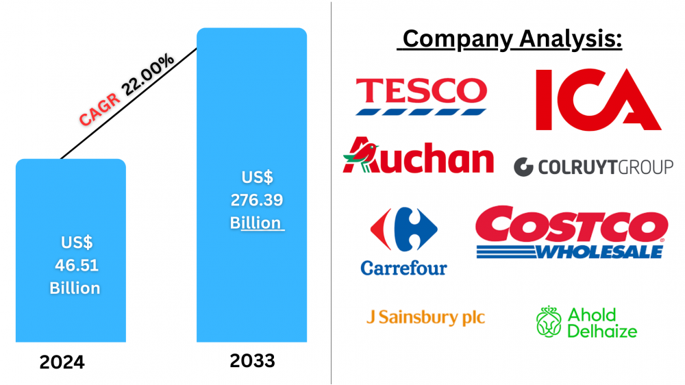 The Europe Click and Collect Grocery Market is rapidly evolving as consumer behaviors shift towards more flexible, convenient, and efficient shopping methods. This model merges the advantages of online shopping with the immediate accessibility of in-store pickups. The market is valued at US$ 46.51 billion in 2024 and is forecasted to reach US$ 276.39 billion by 2033, expanding at a CAGR of 22.00% during the forecast period (2025-2033).