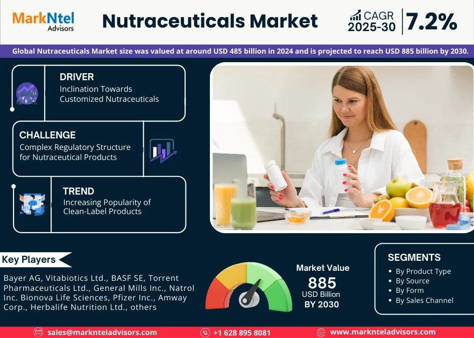 The Nutraceuticals Market size was valued at around USD 485 billion in 2024 and is projected to reach USD 885 billion by 2030. The market is also estimated to grow at a CAGR of around 7.2% during the forecast period, i.e., 2025-30.